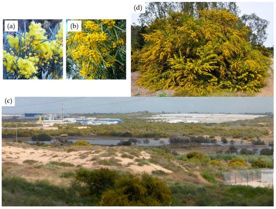 A. saligna and A. salicina, of the mimosa (Mimosaceae) family and legume (Leguminosae) order, spread as shrubs or single-stemmed trees, which can reach up to 9 m in height [38]. They were transported from Australia to many countries around the world, including Italy, New Zealand, Portugal, South Africa, Spain, and the US [39]. Both species were also brought to Israel as early as the beginning of the 20th century by the British colonists and the first Jewish settlers for afforestation of exposed lands, soil conservation, and to stabilize shifting sands dunes. The impressive reproductive strength of Acacia is related to their ability to reach maturity in four years and to produce thousands of viable seeds that form a dense understory under each tree [40]. Since first being planted in Israeli coastal dunes, Acacia spread rapidly, at an annual growth rate estimated at 3% [38].