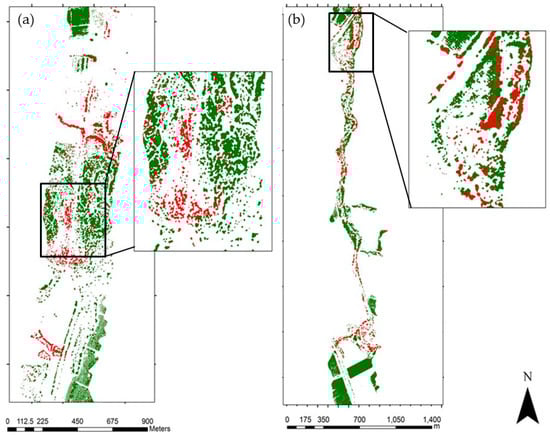Acacia salicina and Acacia saligna classification maps based on species distribution maps from Paz-Kagan et al. [35]. (a) Invasive plant species map of the Negba site with a zoom to the specific invasive location. (b) Invasive plant species map of the Dorot site with a zoom to the specific invasive location. The green color represents the other woody species, and the red color represents the location of Acacia trees.