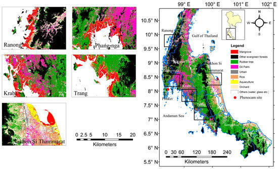 The Land Development Department of Thailand (http://sql.ldd.go.th/ldddata/) in 2012 mapped the mangrove areas in Thailand, which were mainly distributed over the south and east of Thailand. The largest areas of mangrove are in Southern Thailand (about 84% of the total mangrove area of Thailand, 2,235 km2 in 2012) while Rubber tree, Tropical rainforest, Oil palm, and Orchards are the major land use/land cover areas in Southern Thailand, accounting for 36%, 28%, 10%, and 6%, respectively. The mangrove area of Southern Thailand is around 1880 km2 (≈ 3% of land area). The study areas used here involved the mangrove forests along the southern coast of Thailand. The study sites with land use/land cover type are shown in Figure 1. Our study sites were located over a narrow range of latitudes. A mountain chain separated the four study areas on the Andaman Sea from the one study site on the Gulf of Thailand. This resulted in large differences in the timing of monsoonal rains between the western and eastern shorelines of the peninsula. Most of the upland tropical evergreen forests are distributed on a mountain chain that runs North–South along the Malay Peninsula.