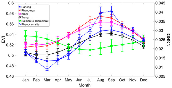 The average monthly EVI seasonal profile at each study site using all mangrove pixels over the 13 years (2002–2014) of EVI data analyzed in this study and averaged monthly NGDRI from phenocam over March 2015 to August 2016 is shown in the Figure 4. The EVI values were mostly between 0.5–0.6 and exhibited strong seasonality at all sites. The seasonal profile of Ranong and Trang province site were similar, with the minimum EVI in February/March and increasing to maximum values in August and then decreasing to a minimum again in the dry season of the following calendar year. The seasonal profiles of Phang-nga and Krabi province site were also similar, with the minimum EVI in February and increasing to a maximum EVI in September. On the other hand, the seasonal profile of Nakhon Si Thammarat province site (on the other side of the peninsula) shows a minimum EVI in July, increasing to a maximum in January of following year. The phenocam color index, NGRDI also exhibited strong seasonality. The seasonal characteristics of this index start with a minimum in March and increase to maximum values in September. Overall, the EVI seasonal profiles at the four Andaman Sea sites from MODIS were similar to the NGRDI from the phenocam data, which was also located at an Andaman Sea site.