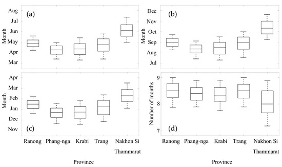 Figure 5 shows TIMESAT derived phenology parameters (SOS, POS, EOS, and LOS) map averaged over the ten years at each of the study sites and the boxplots of phenology metrics are shown in Figure 6. The SOS of Phang-nga and Krabi province sites occurred around April, with SOS of Ranong and Trang province sites occurring one month later, around May, while the SOS of Nakhon Si Thammarat province site was found to be much later, around July. The POS of Phang-nga and Krabi province sites were in August, with POS of Ranong and Trang province sites one month later in September, whereas the POS of Nakhon Si Thammrat province site was not until November. The EOS timings of Phang-nga and Krabi, Ranong and Trang, and Nakhon Si Thammarat province sites were in the subsequent years around January, February, and March, respectively. The averaged LOS for all sites remained the same at approximately 8–9 months. Overall, the phenology Phang-nga and Krabi province sites started earlier than the phenology of site of Ranong and Trang province site, while the temporal cycle of Nakhon Si Thammarat province site was the latest of all five sites. In conclusion, the SOS of all Andaman Sea mangrove sites (west coast) started in April–June, with peaks in August–October and end of the growing season in January–February of the following year, with the length of season about 8 months. For the mangrove phenology at the Gulf of Thailand site (east coast), the SOS started in July, with peaks in November and with an end of the season in March of the following year. The average of length of season of the mangrove at the Gulf of Thailand was similar to the Andaman Sea sites but with a different standard deviation. However, it seems the EVI profile at Nakhon Si Thammarat site (Figure 4a) was quite different compared to the west coast sites and the phenology parameters (especially POS) also were markedly different (Figure 6). If we consider the species contribution (Table 1), we found that there are many mangrove species in the Nakhon Si Thammarat site that are not found in the west coast sites. Averaging EVI for sites with mixed stands of several species may have caused differences in EVI profiles.