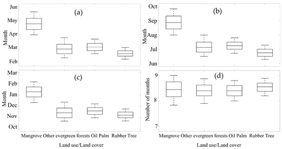 Boxplots of phenology parameters of the major land cover/land use type over Southern Thailand, (a) SOS, (b) POS, (c) EOS, and (d) LOS.