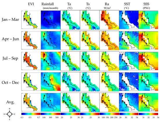 Figure 9 shows the spatial variability of seasonal EVI and environment/climate drivers at quarterly intervals. The difference in the timing of the maximum seasonal rainfall between Andaman Sea and Gulf of Thailand was about 2 months (Figure 8a and Figure 9). However, the minimum rainfall was in February for all sites. The rainfall at Ranong province site was higher than the other sites from April to October.