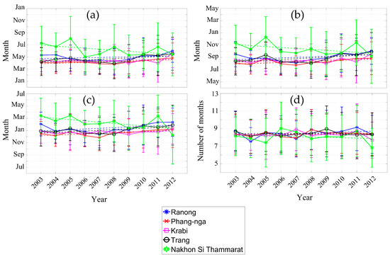 Figure A1 shows the trend of rainfall over ten years. Overall, the rainfall has a positive trend for all sites where the Ranong province site had the most positive trend (+104.971 mm/year, R2 = 0.513, p < 0.05) and the lowest trend was in the Trang province site (+55.821 mm/year, R2 = 0.423 p < 0.05), while the trend of rainfall at Nakhon Si Thammarat province site was not significant. However, the significant positive trend of rainfall at Phang-nga province site may induce a significant delayed trend of phenology for this site including Trang province site.