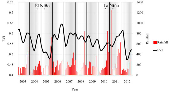Time series of EVI and rainfall at Nakhon Si Thammarat province site over a time period encompassing both El Niño and La Niña phenomena [125].
