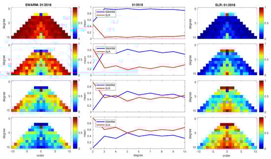 Decreasing the relative weight of the GPS observations further (Figure 2, rows three and four), the contribution of Swarm is step by step reduced to the sectorial (equal degree and order) and near sectorial SHC, where the sensitivity of GPS observations is strong [70], and to C that in case of SLR is weakly determined due to correlations with other zonal coefficients [68].