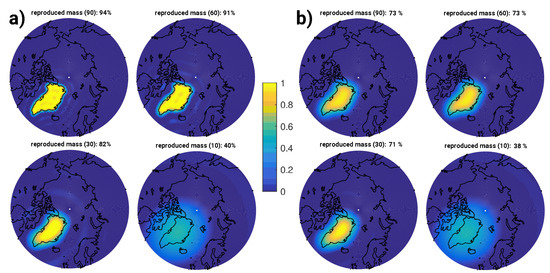 The truncation of the spherical harmonic expansion at a certain maximum degree causes signal leakage (e.g., [23,24,25,26]). To demonstrate this effect, we simulate a mass layer with uniform mass distribution within the island of Greenland, while the mass over the rest of the globe is set to zero. The simulated mass distribution is expanded in a series of spherical harmonics and reconstructed from the SHC truncating the series at various values of . In Figure 3a, the reconstructed mass distributions are shown and the percentage of the integrated mass still contained inside the shorelines of Greenland is listed.