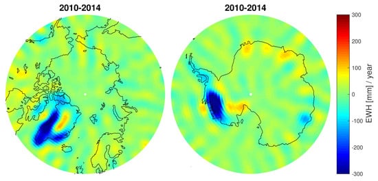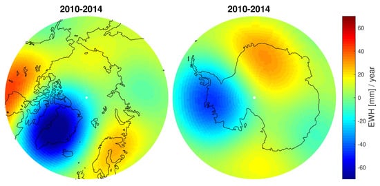 Trends in equivalent water height (EWH) as observed by GRACE in the Arctic (left) or Antarctic (right) region in the period 2010-2014, derived from unfiltered d/o 60 solutions.