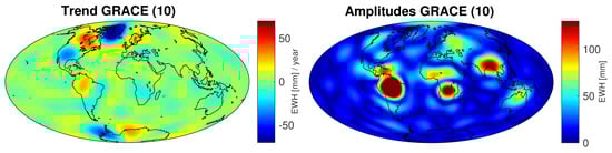 Global trends 2010–2014 in EWH (left) and amplitude of annual EWH variations (right) derived from GRACE gravity fields truncated at d/o 10.