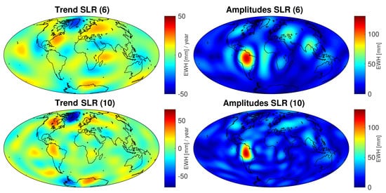 Figure 7 provides the same information as Figure 6, but derived from SLR. In the top row, the unconstrained degree 6 gravity field models, and, in the bottom row, the constrained degree/order 10 solutions are evaluated. Especially in the case of the EWH trends, the improvement of the localization with a higher maximum degree is obvious. In the case of seasonal variations, the amplitudes in all but the Amazon basin are heavily attenuated compared to GRACE (Figure 6, right).