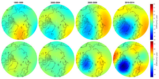 Trends in EWH as observed by SLR in the Arctic region during 5-year periods between 1995 and 2014. Top: unconstrained monthly gravity fields up to degree 6, bottom: constrained monthly gravity fields up to degree 10.