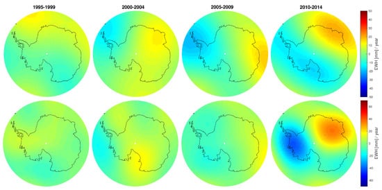 Trends in EWH as observed by SLR in the Antarctic region during 5-year periods between 1995 and 2014. Top: unconstrained monthly gravity fields up to degree 6, bottom: constrained monthly gravity fields up to degree 10.
