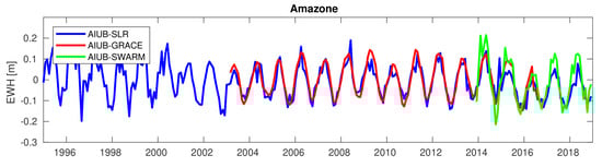 While GRACE observations cover the period 2002–2017, earlier estimates of mass change have to be based on observations of the geodetic SLR satellites. After the end of the GRACE mission, mass estimates are based either on SLR or on Swarm observations. The good agreement of SLR- and GRACE-derived seasonal variations in the Amazon basin is obvious in Figure 10, while Swarm tends to slightly overestimate the seasonal variation.