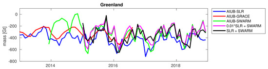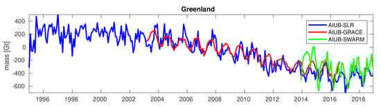 The evolution of the Greenland mass is shown in Figure 11. Again, the long-term agreement of all three observation types is very good. SLR does not reveal significant mass loss in Greenland in the pre-GRACE era. Obviously, the GRACE mission was launched just in time to observe the onset of ice loss in Greenland. After acceleration in the ice mass loss, the GRACE mass estimates almost level out in the time period from 2014 to 2016. SLR tends to slightly overestimate the Greenland mass loss between 2014 and 2017, while, after 2017, even a small mass gain is visible in both the SLR and Swarm derived mass estimates. The reduction of the SLR- and Swarm-derived mass loss therefore is time-shifted by about three years compared to GRACE. Bonin et al. [33] also observe diverging mass trends for Greenland but state that, compared to the independent time-series of mass change derived by the Ice-sheet Mass Balance Inter-comparison Exercise (IMBIE) for Greenland and Antarctica [81], in the long term, these deviations of SLR average out. The inter-annual variability is larger in the monthly SLR estimates than observed by GRACE at this low spherical harmonic degree, and even larger in the monthly Swarm solutions.