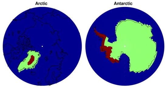 Consecutively, mass trends were determined for the coastal regions of Greenland with strong mass loss, the region of the inland ice sheet, where a weak gain in mass is observed by GRACE, and the coast of West Antarctica. The masks used are provided in Figure 12. The separation of Greenland into regions of mass gain and regions of mass loss was done based on Figure 4. The mask of Antarctica and its glacial sub-basins is derived from Horwath and Dietrich [82].