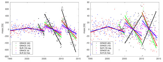In case of SLR, the trend estimation is based either on the unconstrained degree 6 monthly gravity field solutions or on the regularized degree 10 solutions (compare Figure 8 and Figure 9 for the corresponding spatial plots). For comparison, the original degree 60 GRACE gravity fields were truncated at degrees 6 or 10 and also mass trends in 5-year intervals determined.