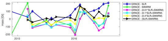 To fill the gap between GRACE and GRACE-FO, we propose a combination of gravity fields derived by multi-SLR and Swarm analysis as detailed above. A very simple combination of SLR and GRACE, in fact the replacement of C estimates in the monthly GRACE gravity fields by values derived from SLR, is already common practice [76]. In contrast to this, we perform a combination of Swarm and SLR on the NEQ level, i.e., we solve the equation