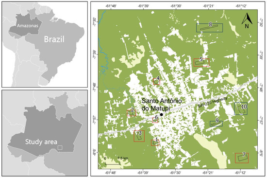 The study area is located in the south of the Brazilian State of Amazonas. Amazonas is the largest state in Brazil (1.5 million km2) and holds the largest area of intact forests within the Brazilian Amazon [51]. This study was carried out in a focus area, bisected by the Transamazon Highway (BR 230), near the Village of Santo Antonio do Matupi (Figure 1). The area is one of the main timber production zones within the State of Amazonas [52]; the surrounding region is known as a deforestation hotspot [51].