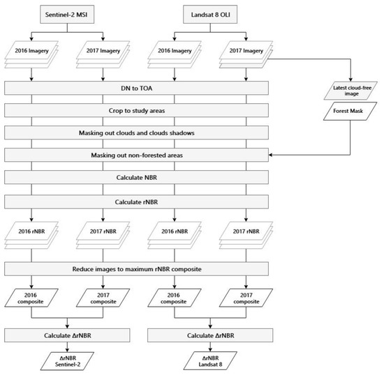 Flowchart of the steps used to generate the delta self-referenced normalized burn ratio (ΔrNBR) image. MSI: MultiSpectral instrument; OLI: Operational land imager; DN: digital numbers; TOA: Top of atmosphere reflectance; NBR: normalized burn ratio; rNBR: self-referenced normalized burn ratio.