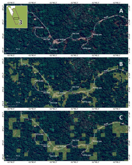 Detail of the sustainable forest management (SFM area nº03, showing: A) The field data collected, B) the areas classified as disturbed according the Sentinel-2, and C) Landsat 8. Background image: Very-high-resolution image from 8 September 2017, available in Google Maps API and accessed via QGIS OpenLayers plugin.