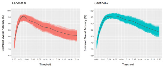 Estimated overall accuracies [62] of disturbance maps derived from 200 ΔrNBR thresholds, based on the bootstrapping approach applied for Landsat 8 and Sentinel-2 data (bootstrap average appears as a smooth curve).