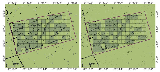 In order to assess the forest area impacted by selective logging, we applied a regular grid of 300 m × 300 m spatial resolution on the pixel-based results from both sensors, leading to 252 full grid cells over the forest of the seven SFM areas. The size of the grid cells is similar to a radius of 180 m from the mapped disturbance areas, as proposed by References [15] and [21], to assess the forest area directly or indirectly affected by selective logging. The grid area typically contains features such as smaller sized logging infrastructure (small felling gaps, narrow logging roads, skid trails) and residual damaged vegetation due to the logging operations [73], which are not detectable by remote sensing imagery. In addition, due to the use of permanent assessment units, a grid cell approach has the advantage of enabling a long-term assessment of the forest disturbances related to selective logging, which is highly dynamic in space and time. A grid approach with the same grid cell dimensions has been used to monitor selective logging with Landsat imagery over 15 years in Mato Grosso State by Reference [34].