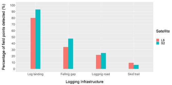 In a study performed in Guyana that mapped logging activities with Sentinel-2 data, it was noted that skid trails could not be identified using Sentinel-2 imagery [81]. This highlights the fact that skid trail damage is almost impossible to detect with optical remote sensing data available today because of its “below canopy” location (Figure 3). The logging roads in our study areas are secondary roads, built to be temporary and ranging from 4 m to 6 m in width. This could explain the lack of “detectability” for this kind of infrastructure. Nonetheless, the detectability of logging features confirms a better performance by Sentinel-2 (Figure 6), even if the difference from Landsat 8-based values is small. However, given the higher spatial resolution of Sentinel-2, these differences between the sensors are smaller than expected.