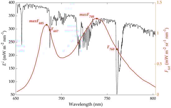 Down-welling irradiance (E↓, black line) at ground level and sun-induced chlorophyll fluorescence spectrum (red line). Maximum value of fluorescence at 685 nm (maxF685) and 740 nm (maxF740) and sun-induced fluorescence at the O2B (F687) and O2A (F760) absorption features are indicated.