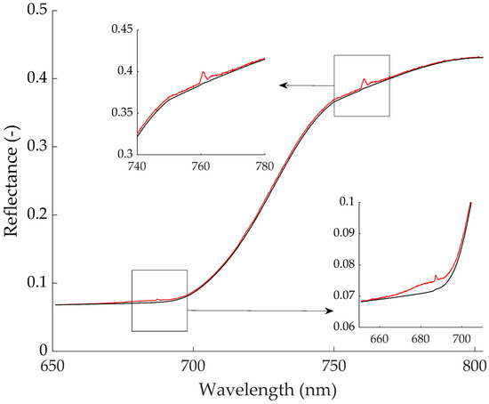 Actual reflectance (R, black line) and apparent reflectance (Rapp, red line). The actual reflectance was computed as the ratio between reflected radiance (LR) and down-welling irradiance (E↓); the apparent reflectance was computed as the ratio between total up-welling radiance (L↑ = LR + F) and down-welling irradiance (E↓). The small plots highlight the apparent reflectance. That is the contribution of fluorescence to the reflected radiance spectrum.