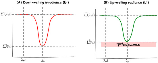 Fraunhofer line depth (FLD) method. (A) The solar down-welling irradiance (E↓) is affected by narrow absorption feature. (B) The measured up-welling radiance (L↑) present the absorption feature partially filled with fluorescence emission (adapted from Alonso et al. 2008 [12]).