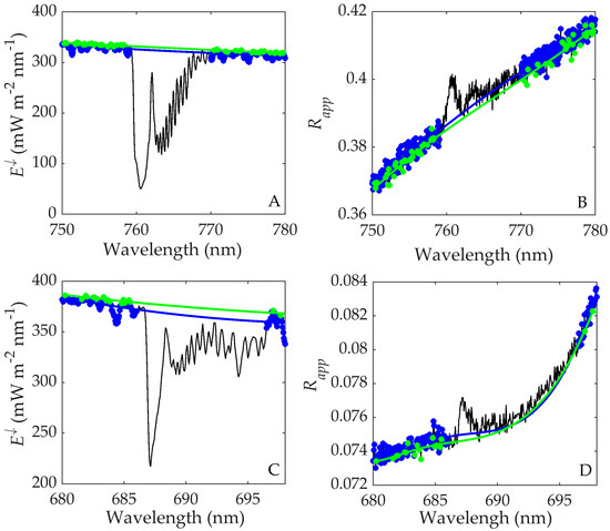 Example of correct (green) and incorrect (blue) implementation of polynomial second-order interpolation for the down-welling irradiance (E↓, A,C) and cubic spline interpolation for the apparent reflectance (Rapp, B,D) at O2B (F687, C,D) and O2A (F760, A,B) bands.