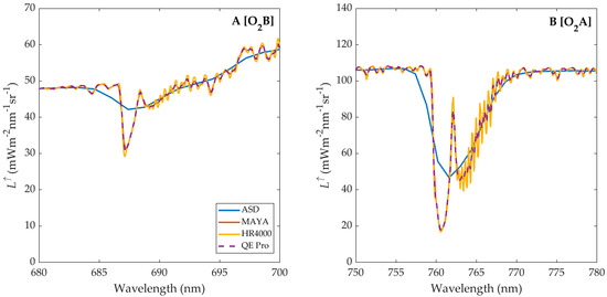 Up-welling radiance (L↑) modeled with the spectral resolution and spectral sampling interval of ASD, MAYA, HR4000, and QE Pro spectrometers in correspondence of the O2B (A) and O2A (B) bands. Data were modeled for a typical plant canopy using FluorSAIL3 and then degraded to the respective spectral resolution of the instrument.