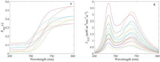 For the data simulation, we employed a combination of the RMT FluorSAIL3 and MODTRAN-5 [41] to simulate radiance (LTOC) and top-of-canopy (TOC) irradiance (ETOC), respectively. FluorSAIL3, an extended version of the physically based FluorSAIL model [42], provides simulations of surface reflectance and emitted SIF with a spectral resolution of 1 nm. The coupling with the atmosphere was realized using the four-stream theory [43], while atmospheric functions were calculated with MODTRAN-5 [41]. Table 2 and Table 3 list the simulation parameters and variables used in this study representing 16 typical vegetation targets, observed under a cloudless sky. We deliberately considered vegetation types as defined in Damm et al. [32] to relate our results with previous investigations and allow progress in the field of SIF proximal sensing to be tracked. The advantage of using simulated data is that SIF emission and surface reflectance are precisely known (Figure 6). ETOC↓ and LTOC↑ were simulated assuming Lambertian surface reflectance and neglecting adjacency effects following