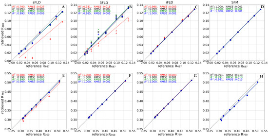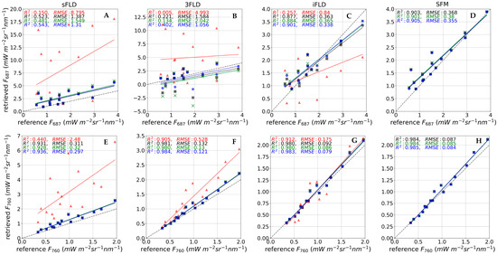 Considering retrieval in the O2A band using high-resolution instruments, we obtain nearly identical results for F760 estimates using 3FLD, iFLD, and SFM methods where the regression lines of F760 (Figure 7E–H) and R (Figure 9E–H) are close to the 1:1 line (R2 ≈ 0.98 and RMSE ≈ 0.08 mW m−2 sr−1 nm−1). In more detail, the SFM approach has a tendency to underestimate R, while 3FLD, iFLD, and SFM overestimate F760 for higher F values. On the other hand, sFLD and 3FLD applied to low-resolution sensors constantly overestimated F760. However, when using the iFLD, an R2 = 0.91 and RMSE = 0.18 mW m−2 sr−1 nm−1 was found. The sFLD performs worst in estimating F760 with a significant overestimation for all sensors (R2 = 0.93–0.94 and RMSE = 0.3–0.32 mW m−2 sr−1 nm−1). As described by Damm et al. [32], the strong overestimation of F760 by the sFLD method is caused by a violation of the assumption that R and F are spectrally constant over the O2A band. The 3FLD and iFLD methods assume a linear and non-linear relationship respectively between R and SIF, which results in a better prediction of R and F760.