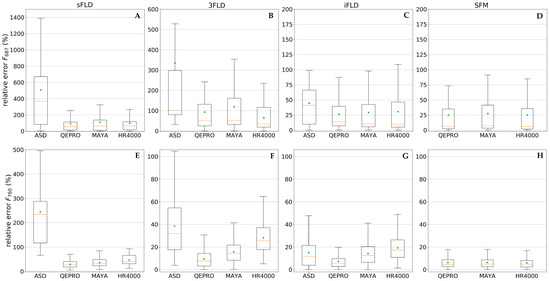 Figure 8 shows the RE of retrieved F obtained when including noise. In spite of its high SNR, the ASD shows the highest RE for F760 and F687, where sFLD performs worst (RE = 234.5 mW m−2 nm−1 sr−1, 370.1%) and iFLD best (RE = 11.8 mW m−2 nm−1 sr−1, 41.2%). The high-resolution sensors QEPro, MAYA, and HR4000 provide better F estimates with lower RE for SFM (F760 = 4.5–4.9%, F687 = 5.9–7.2%) compared to the iFLD method (F760 = 4.7–9.3%, F687 = 9.7–13.4%). From these three sensors, the QE Pro produces lowest RE for F760 and the HR4000 lowest RE for F687. The SFM furthermore shows the lowest error range and lowest mean RE for F760 and F687 (6.2–6.5% and 25.3–27.8%).
