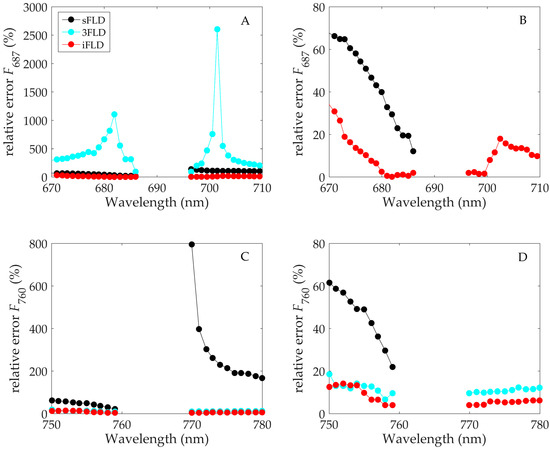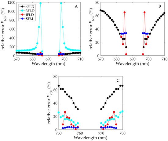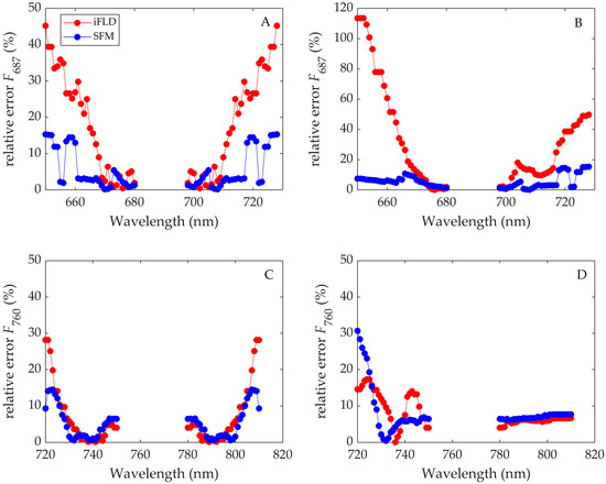 Importantly, when retrieving SIF with the sFLD or 3FLD, the relative error was 2–6 (QE Pro-F760) and 6–11 (HR4000–F687) times higher than with the SFM. Moreover, when retrieving SIF using the ASD simulated data, the error was 2–10 times higher than when using spectrometers with a finer spectral resolution, suggesting the need for care when interpreting SIF results retrieved with the sFLD and 3FLD and/or with spectrometers with SSI ≥ 1.4 nm and FWHM ≥ 3 nm.