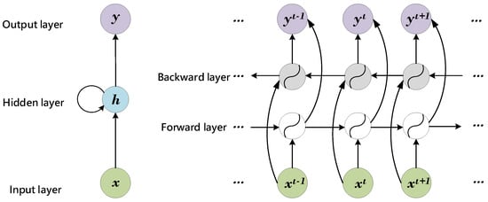 The architecture of RNN is illustrated in the left part of Figure 2. For a hidden layer in RNN, which maintains a hidden state at each time iteration, it receives the input vector , and generates the output vector . The unfolded structure of a bi-directional RNN (Bi-RNN), shown in the right part of Figure 2, presents the calculation process. Bi-RNN connects two hidden layers running in opposite directions to a single output, allowing them to receive information from both past and future states. Neither of these output states is connected to inputs of the opposite directions. By simultaneously employing both directions of input data, information both from the past and future can be used to calculate the output.