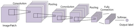 Another popular deep learning model for vision tasks is CNN [35]. Fundamentally, the mammalian visual system has a spatial hierarchy. Inspired by this, CNN has a trainable multilayer architecture composed of a series of convolution layers, non-linearity layers, and pooling layers stacked alternately. It is used to learn low-level features such as edges or textures and high-level features with more discriminative information [36,37,38,39,40]. A typical CNN structure is shown in Figure 3.