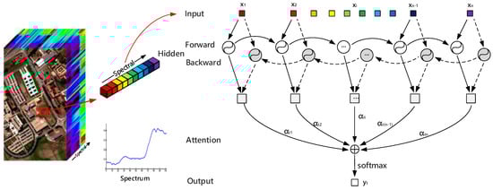 Bi-RNN model with attention mechanism for spectral classification. Every pixel vector is regarded as a sequence, the hundreds of spectral bands are input into the gated recurrent unit (GRU) cell one by one. Both forward and backward features are captured by Bi-RNN and re-weighted by the attention layer.