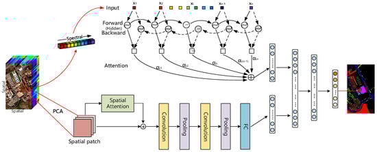 - We design a joint network with a spectral attention bi-directional RNN branch and a spatial attention CNN branch to extract spectral-spatial features for HSI classification. An attention mechanism is used to emphasize meaningful features along the two branches, as shown in Figure 1. Our goal is to improve representation ability by using the attention mechanism, namely, to focus on the correlations between adjacent spectral dimensions and the spatial dependency in spatial domain, as well as to suppress unnecessary features.