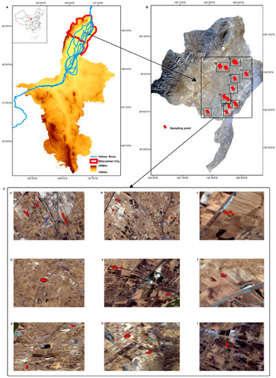 Study area and sampling location. (A) A Digital Elevation Model (DEM) diagram of the Ningxia Hui Autonomous Region, made using the original elevation data of the Shuttle Radar Topography Mission (SRTM) DEM 90-meter resolution data product. (B) The sampling location around the Yellow River Irrigation region in Shizuishan City, made from the Landsat 8 data of April 2018. (a–i) in B correspond one-to-one with (a–i) in (C) and show the specific position and surrounding conditions of the sampling point.