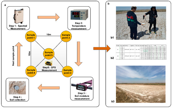 Field data measurement. (a) The steps of the field data collection; (b1) the spectrum measurement photo, (b2) the record of the collected data, and (b3) the saline-alkali photo of one of the data collection sites. The white matter on the land-like snow was the salt on the surface of the land, indicating that the salinization of this cultivated land was very serious.