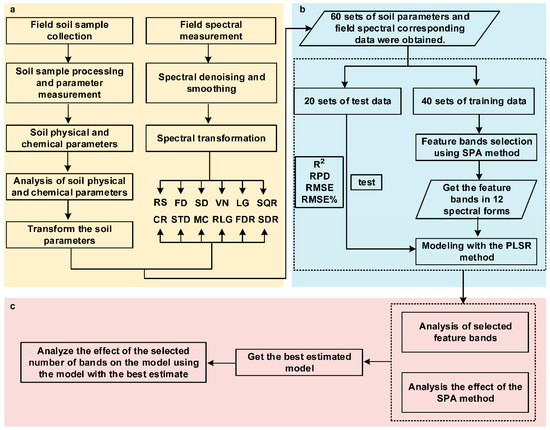 The method in this paper is mainly divided into three parts, the first part is data preprocessing, the second part is modeling, and the third part is analysis. Data preprocessing is divided into soil parameter data processing and field spectral data processing. A total of 60 sets of spectra and soil parameter data were obtained after pretreatment. Sixty sets of data were randomly divided into 40 sets of training data and 20 sets of test data. Modeling was done with 40 sets of training data, the modeling process was divided into the SPA method, to extract feature bands, and the PLSR method for modeling. Then, 20 sets of the test data were used to test the estimated effect of the model. The analysis was carried out in terms of feature bands, model comparisons, and the number of model bands. The main method process is shown in Figure 3.