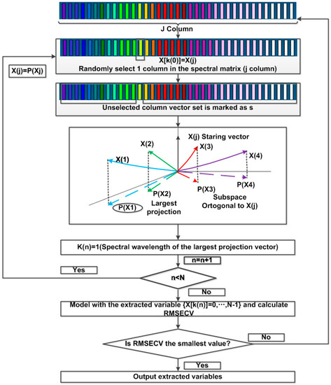 The Successive Projections Algorithm (SPA) was able to fully search for the variable group that contained the minimum redundant information from the spectral information, to minimize the collinearity between variables [36]. At the same time, the number of variables used in modeling could be greatly reduced, and the speed and efficiency of modeling could be improved. As we can see from Figure 4, the SPA was a forward selection method, that is, it started with one wavelength, then incorporated a new one at each iteration, until a specified number N of wavelengths was reached. The SPA employs simple projection operations in a vector space to obtain subsets of variables with small collinearity [37]. Therefore, the SPA method could well solve the collinearity problem, reduce the number of variables, and could be used for the screening of spectral feature wavelengths of large data quantities. The core formula is as follows:
