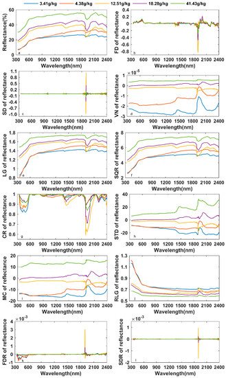 The raw spectra were transformed in 11 ways, and a total of 12 different spectral representations were obtained. Since the spectral was limited by conditions, there was more noise information between 2400 nm to 2500 nm, so in the subsequent analysis and processing, we would discard the spectral range from the raw spectra. As shown in Figure 6, it could be seen from the RS that the higher the salt content of the soil, the larger the spectral reflectance. This is because the spectral measurement time is the salt return period of the soil. The greater the salt content of the soil, the more salt is accumulated on the surface of the soil and the greater is the measured spectral reflectance. Additionally, there was a slight decrease in the RS between 1300 nm and 1500 nm and between 2100 nm and 2300 nm, and there was an absorption band at approximately 1900 nm (Figure 6a). The morphology, variations, and change intervals of logarithm of the reflectance spectra (LG) and square root of the reflectance spectra (SQR) were almost identical to RS, except that the magnitude of some changes was slightly compressed (Figure 6e,f). When the FD was between 300 nm and 600 nm, the higher the soil salinity, the higher was the value of the FD. Moreover, the FD with high soil salinity had a negative value between 1300 nm and 1500 nm and between 2300 nm and 2400 nm, and the FD value with low soil salinity was a positive number. Between 1900 nm and 2100 nm, the value of FD with a high salt content was significantly higher than the value of FD with a low salt content (Figure 6b). Between 300 nm and 600 nm, the vector normalization of the reflectance spectra (VN) and the mean center of the reflectance spectra (MC) of the soil with low salt content showed a slight downward trend, and the soil curve with high salt content showed a straight or slightly rising trend. Their other characteristics are similar to those of RS (Figure 6d,i). The range of CR that distinguished between the most significant changes in soil salt content is 300 nm to 700 nm. The lower the soil salt content, the smaller the CR value (Figure 6g). Between 1500 nm and 1700 nm, the standardization of the reflectance spectra (STD) with low salt content in the soil presented a trough, and the curve with high salinity showed a peak (Figure 6h). The lower the soil salinity, the faster the reciprocal of logarithm of reflectance spectra (RLG) decreases between 300 nm and 600 nm. At the same time, there was a peak in the curve between 1900 nm and 2100 nm (Figure 6j). SD, FDR, and SDR with different salt contents were almost superimposed and difficult to distinguish. Only FDR could distinguish between salt levels from 300 nm to 700 nm (Figure 6c,k,l).