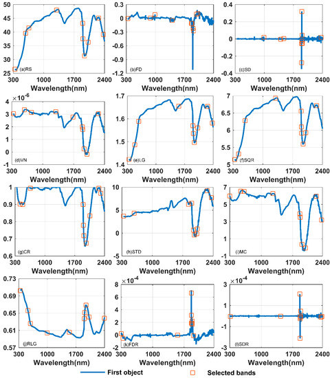 The selected bands of different transformation (a) the raw reflectance spectra (RS), (b) the first derivative of the reflectance spectra (FD), (c) the second derivative of the reflectance spectra (SD), (d) the vector normalization of the reflectance spectra (VN), (e) the logarithm of the reflectance spectra (LG), (f) the square root of the reflectance spectra (SQR), (g) the continuum removal of the reflectance spectra (CR), (h) the standardization of the reflectance spectra (STD), (i) the mean center of the reflectance spectra (MC), (j) the reciprocal of logarithmic of reflectance spectra (RLG), (k) the first derivative of reciprocal of the reflectance spectra (FDR), and (l) the second derivative of the reciprocal of the reflectance spectra (SDR).