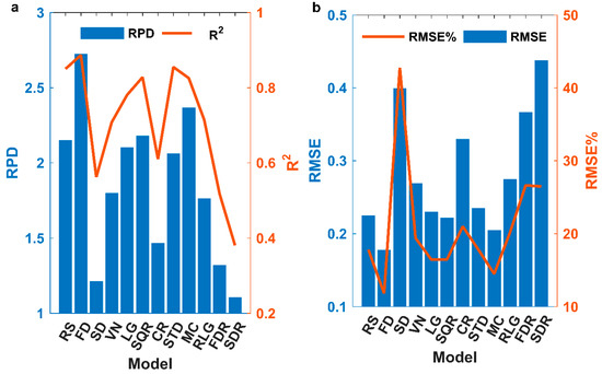 Model estimate results. Model estimation results of the SPA–Partial Least Squares Regression (PLSR) based on different spectral forms. (a) Represents the ratio of performance to deviation (RPD) and of the model estimation result, and (b) represents the root mean square error (RMSE) and RMSE% of the model estimation result.