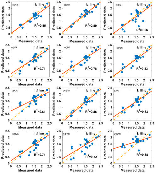 The goodness of the model prediction is reflected by . The values indicate the strength of correlation between measured and predicted values [20]. The RPD value provides a basis for standardizing the RMSE. It measures the ratio of percentage deviation to the RMSE and represents the precision of the model. RPD values of less than 1.5 indicate very poor model predictions, between 1.5 and 2.0 indicate poor model predictions, and greater than 2.0 indicate very good model predictions [40]. RMSE is the standard deviation of the residuals (prediction errors). RMSE% refer to the range of the predictions [41].