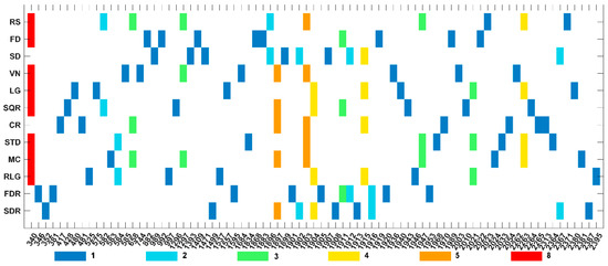 Concentrated map of selected bands of the different spectral forms. The horizontal axis represents the wavelength of the selected band, and the vertical axis represents the 12 spectral forms. The different colors indicate the number of times each wavelength was selected. From left to right, the wavelength selected for each form can be known. From top to bottom, which form is selected for each wavelength can be seen.