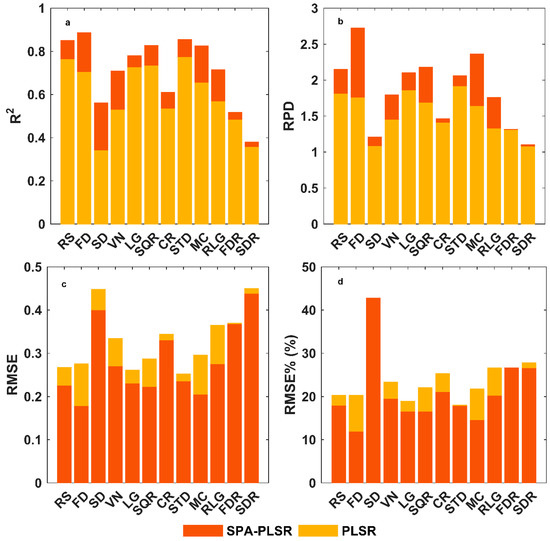 Comparison of the SPA–PLSR and PLSR results. (a) Shows the change in R2; (b) shows the change in RPD; (c) shows the change in RMSE; and (d) shows the change in RMSE%. The red bar chart represents the results of the SPA–PLSR model, the yellow bar chart represents the results of the PLSR model.